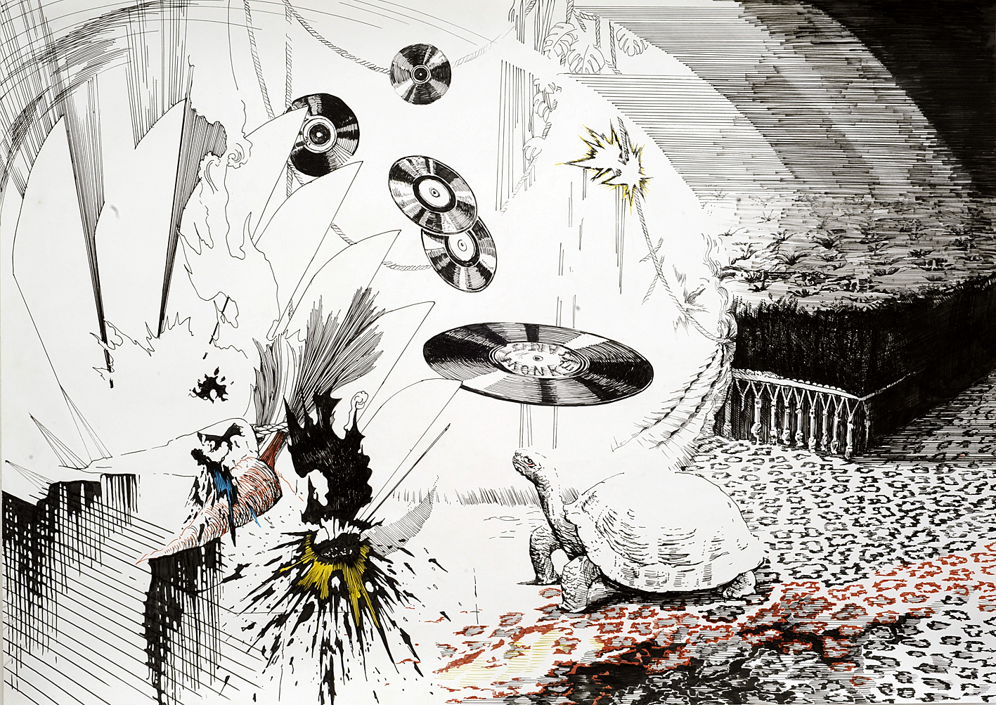 In der Ausstellung werden bildträchtige Schlüsselstellen des Romans von den eingeladenen Künstler/innen interpretiert. So entsteht eine Art »Bildroman« oder »Pictorial Novel«, welche/r prägnante Erzählpassagen der Vorlage annähernd erkennen lässt. Zu sehen sind über hundert eigens für die Ausstellung gefertigte Bilder und Zeichnungen in einer Art begehbaren Moritatentafel. Textpassagen auf der Wand verdeutlichen zusätzlich den Handlungsverlauf. Eine vielfältige Autorenschaft führt hier auch zu einem Hauch Gesamtkunstwerk. Zudem mischt sich in dieser Ausstellung die vermeintlich vordergründige Bebilderung einer skurrilen Geschichte gezielt mit Reflexionen über das eigene Metier.