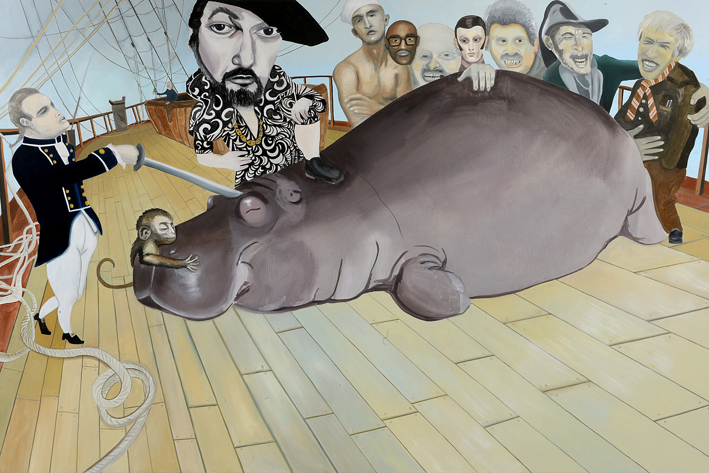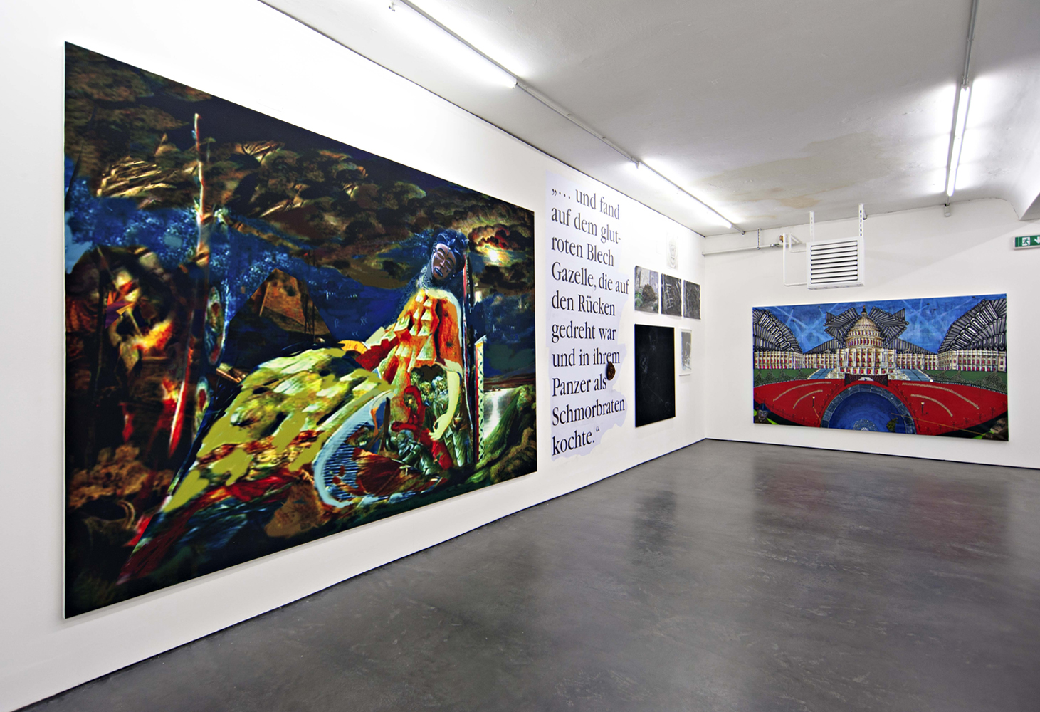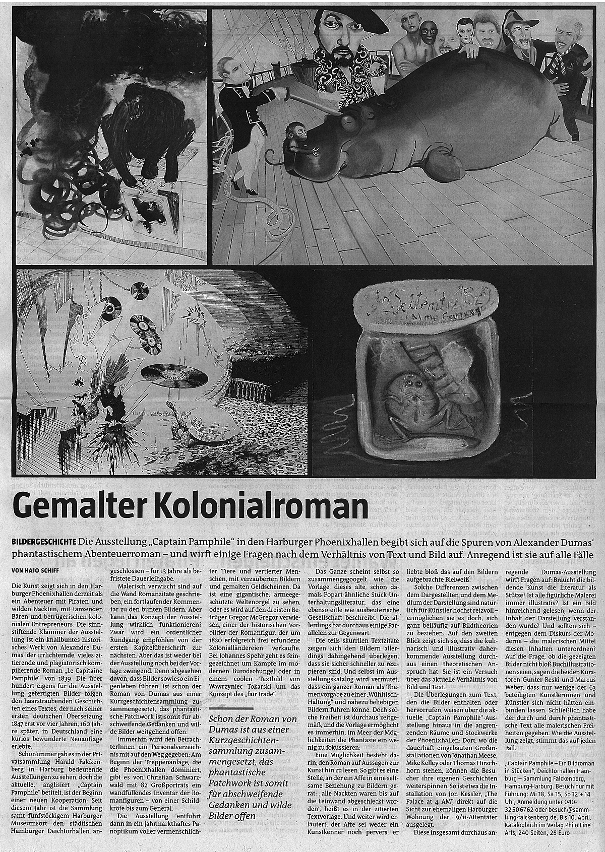 The Pamphile Show in its third version presents now 62 international painters. The group show is like an open instructed collaborative work with a turn of superstructure. Starting point is the novel "Capitan Pamphile" by Alexandre Dumas published 1839. Especially the end of this book can be read as a current description about running economical crises and crashs that that happenened a few years ago. A significant selection of particulary visual scenes in the novel should become traceable, so one might get parts of the storyline, even though this might be hardly possible. The multitude of different authorships here may induce a soft touch of `Gesamtkunstwerk´. Broken handmade literary film or trailer about the book are other keywords to describe the idea of this group show. In the last years narration or storytelling techniques had been one main focus in contemporary art. Here now this show tries to turn those singular spot-like narrative moments into an extended and collaborative format. Further on a term like ´pictorial novel´ (Charlotte Salomon, William Hogarth, Pushwagner) had been essential developing this show.